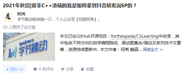 要从知乎说起了,我把自己的秋招总结上传到知乎上了,就是这篇文章「双非渣硕的秋招之路总结(已拿抖音研发岗SP)